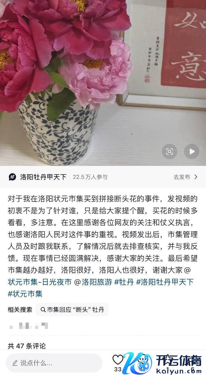 大皖新闻讯 4月6日晚,又名旅客在外交平台发文吐槽kaiyun网址,马上激发烧议。该旅客称,简洁假期,她往返一千多公里专程前去河南洛阳游玩,临别之际专门在洛阳状元市集购买了一束牡丹带回家中莳植。不虞回家后发现,其中一枝牡丹——花苞与根茎早已永别,仅靠一根牙签强迫固定——竟是“断头花”。(详见此前报说念)4月8日晚,洛阳状元市集蓝V认证商家号发布情况诠释,“说明花并非市集内商户所售。”