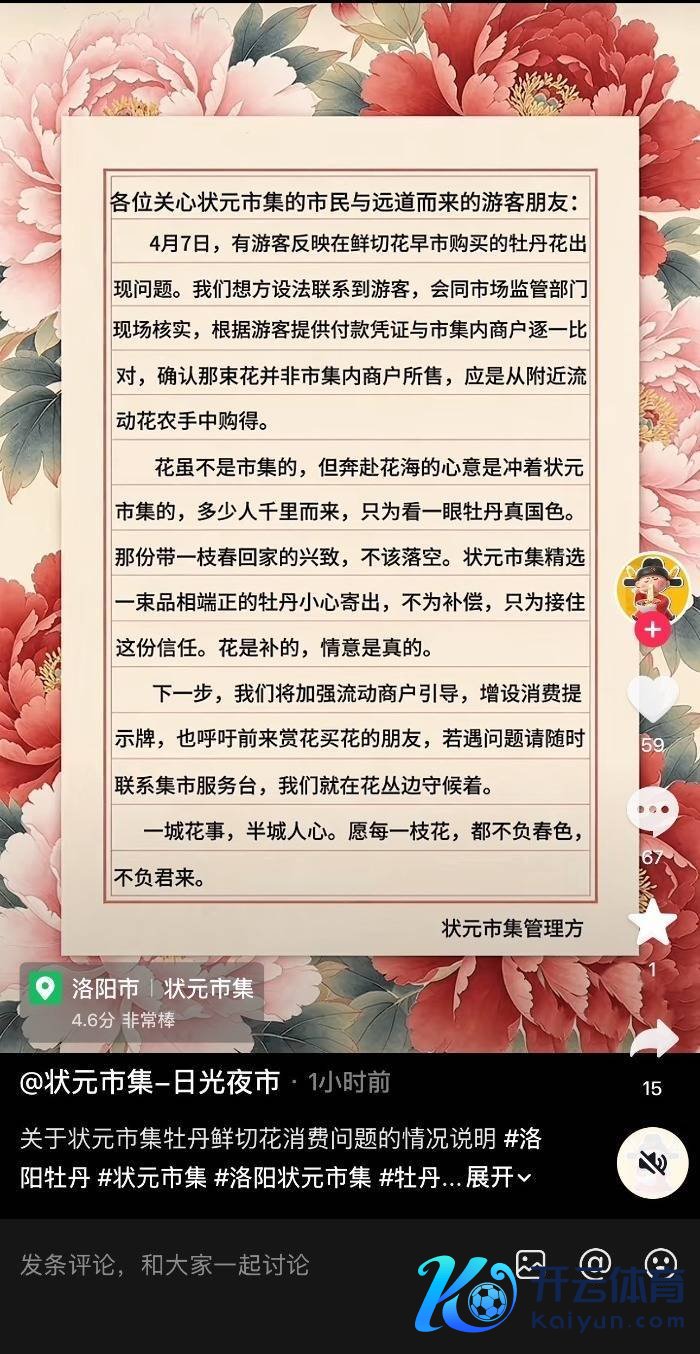 诠释中同期写说念:“花虽不是市集的,但奔赴花海的情意是冲着状元市集的。若干东说念主沉而来,只为看一眼牡丹真国色。那份带一枝春回家的兴味,不该破碎。”为此,状元市集精选一束品相步骤的牡丹防御寄出,“不为赔偿,只为接住这份信任。花是补的,情意是的确。”