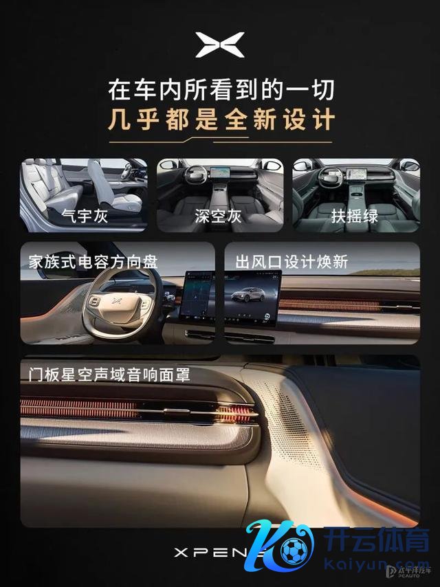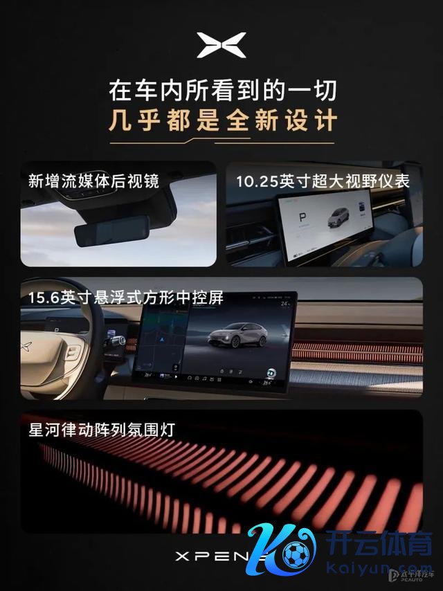 内饰方面,新款小鹏G6提供深空灰、气宇灰、扶摇绿三款主题配色,全体延续现金车型布局诡计,其中中控屏幕从14.96英寸晋升至15.6英寸,并秉承悬浮式诡计,以及配备10.25英寸液晶姿首和怀挡式电子换挡杆。此外,空调出风口进行焕新诡计,内饰材质和造型也进行了升级,手感更佳。