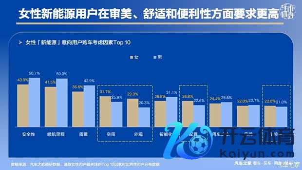 男女用户在采取新动力车时的磋议身分看似一致,但细节永别很大。男性用户相对更为理性,磋议身分要点蚁合在三大中枢问题安全性、续航里程和质地,而女性用户对这三项的温雅占比均未突出50%。比拟之下,对空间、外不雅、竖立和操控性方面王人男性用户偏好度更高。颜值高、乘坐舒坦的同期还要好开易于独霸,对女性而言更为遑急。