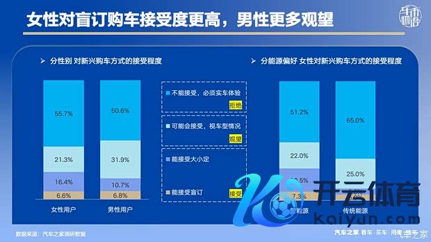 跟着新势力品牌的崛起,盲订、大小定的意见深刻汽车奢华市集,比拟男性用户,女性用户在购车有预备上呈现出既保守又先锋的昭着特征。55.7% 的女性用户默示无法袭取盲订,坚握必须实车体验后再购买,这一比例高于男性用户的 50.6%。但在知足袭取大小定与盲订的群体中,女性用户占比达23.0%,光显高于男性用户的 17.5%。举座来看,女性用户购车预备清亮、有预备飘动,很少无动于衷。从动力偏好细分,偏好新动力车的女性用户对盲订袭取度更高,比偏好传统燃油车的女性用户突出16.8 个百分点。