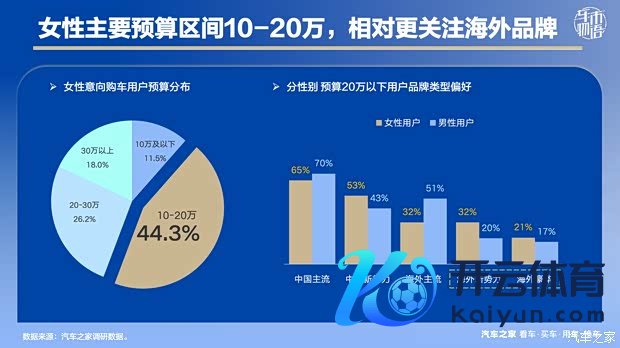 与男性用户比拟,女性用户的购车预算更多蚁合在10-20万区间,占比44.3%,20万以下总占比达到55.7%,比男性用户高14.6个百分点。品牌偏好方面,女性用户相对更为温雅国外高端品牌,其中国外新势力偏好占比比男性用户高12个百分点,对国外豪华的偏好突出4个百分点。此外,对中国新势力偏好也光显更高,占比突出男性用户10个百分点。