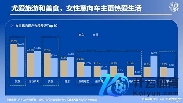 在个东谈主酷爱酷爱爱好方面,女性用户比拟男性愈加理性、丰富多彩,她们更可爱与酬酢有关的作为。Top 10爱好维度中,女性用户对旅游、好意思食、影视综艺、亲子育儿、宠物、时尚穿搭以及影相录像王人发达出更浓厚的酷爱酷爱。因此,时尚个性的车主作为、跨界的IP联动等王人会更诱骗她们温雅。