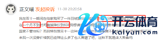 在本月中有破钞者向黑猫投诉平台反馈,我方在双十一工夫以1003.5元的价钱购买了一件NewBalance 的羽绒服,在购买不及一个月的时辰里羽绒服的话价钱裁减至698元。破钞者以为这显然是割韭菜的步履,质疑为何双十一这种大促时辰内价钱保险莫得延伸,反而很短。终端11月末,NewBalance累计投诉191件,汇报率仅1%。