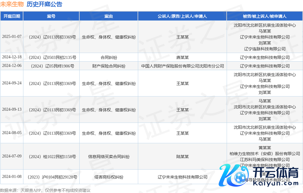 本站音讯,凭据天眼查APP走漏,近日公布了一则辽宁异日生物科技有限公司行为被告/被上诉东说念主的开庭公告kaiyun网址,留神本色如下: