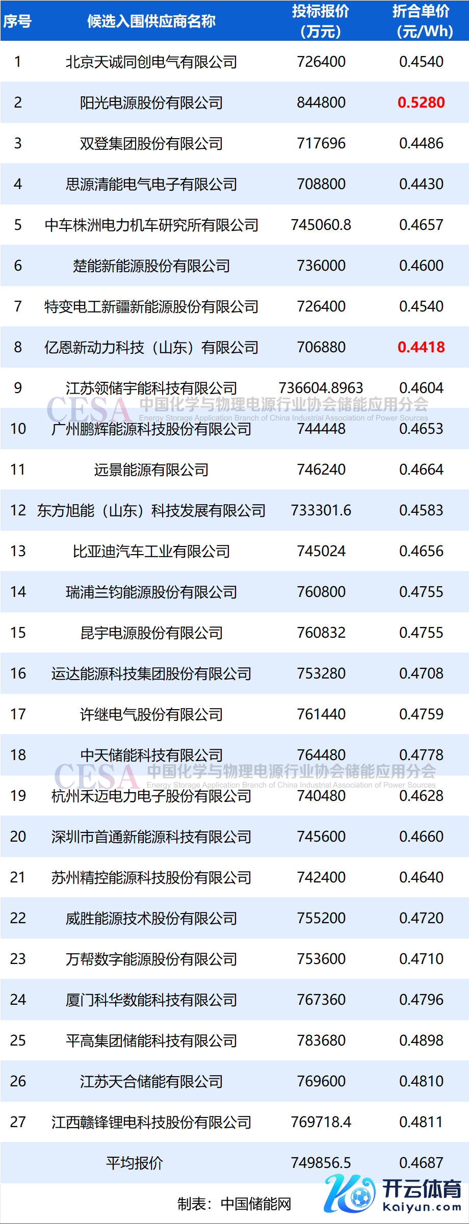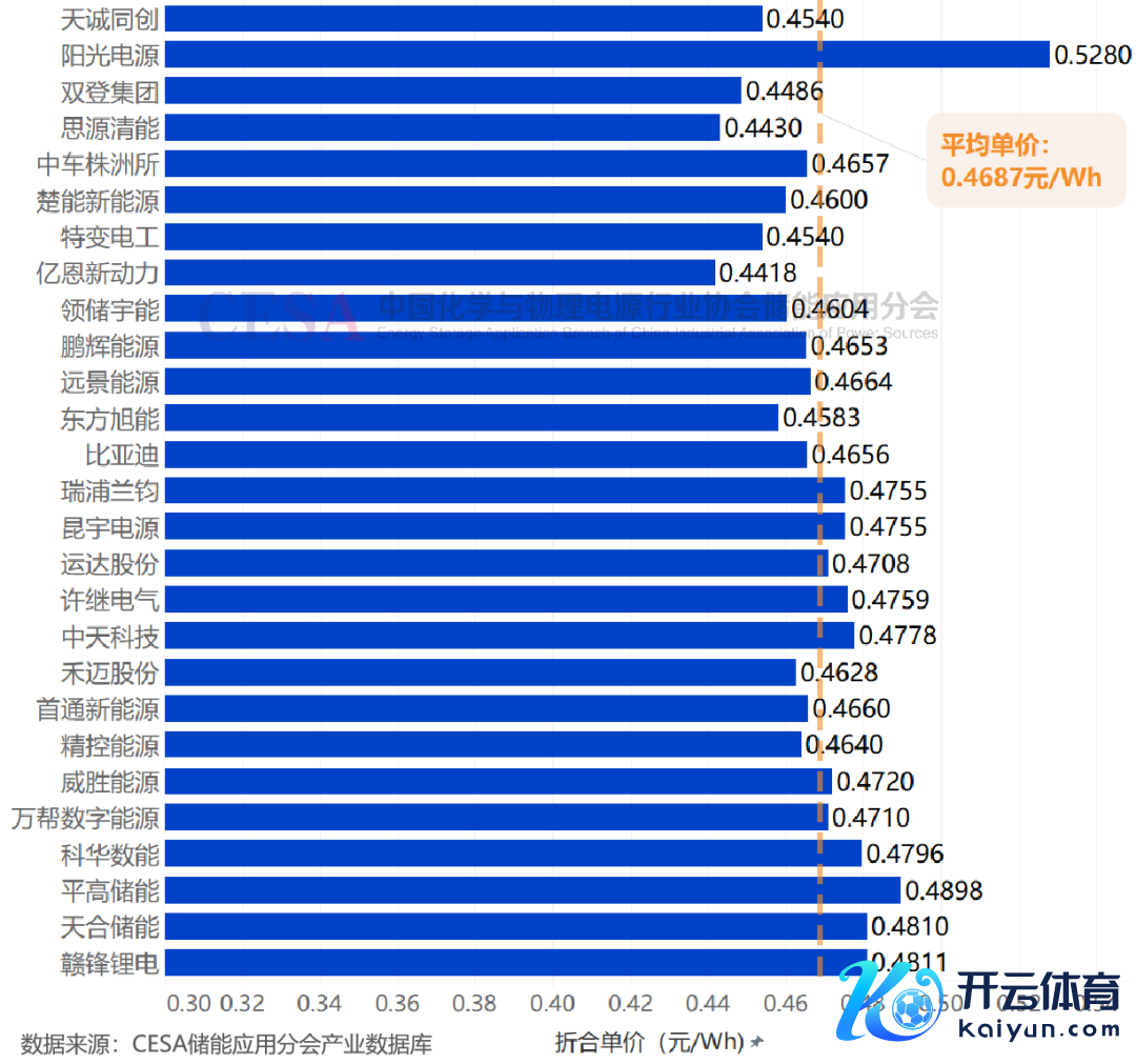 这次入围的这27家企业投标报价范畴在0.4418-0.528元/Wh,平均单价0.4687元/Wh。最低报价来自于亿恩新能源,其报价为70.688亿元,折合单价0.4418元/Wh,最高报价来自于阳光电源84.48亿元,折合单价0.528元/Wh,亦然入围企业中独一逾越0.5元/Wh的企业。