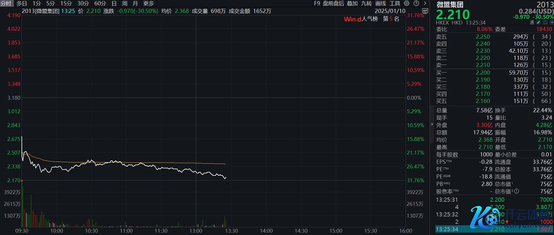 1月10日,港股微盟集团股价大幅低开,早盘捏续走低,午后跌幅扩大至30%。