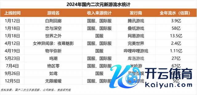 按照往年的通例,笔者统计了 2024 年全年活水过亿的二次元新游发达,数据基蓝本自 B 站 UP 主"国产二次元手游不雅察"的估算。