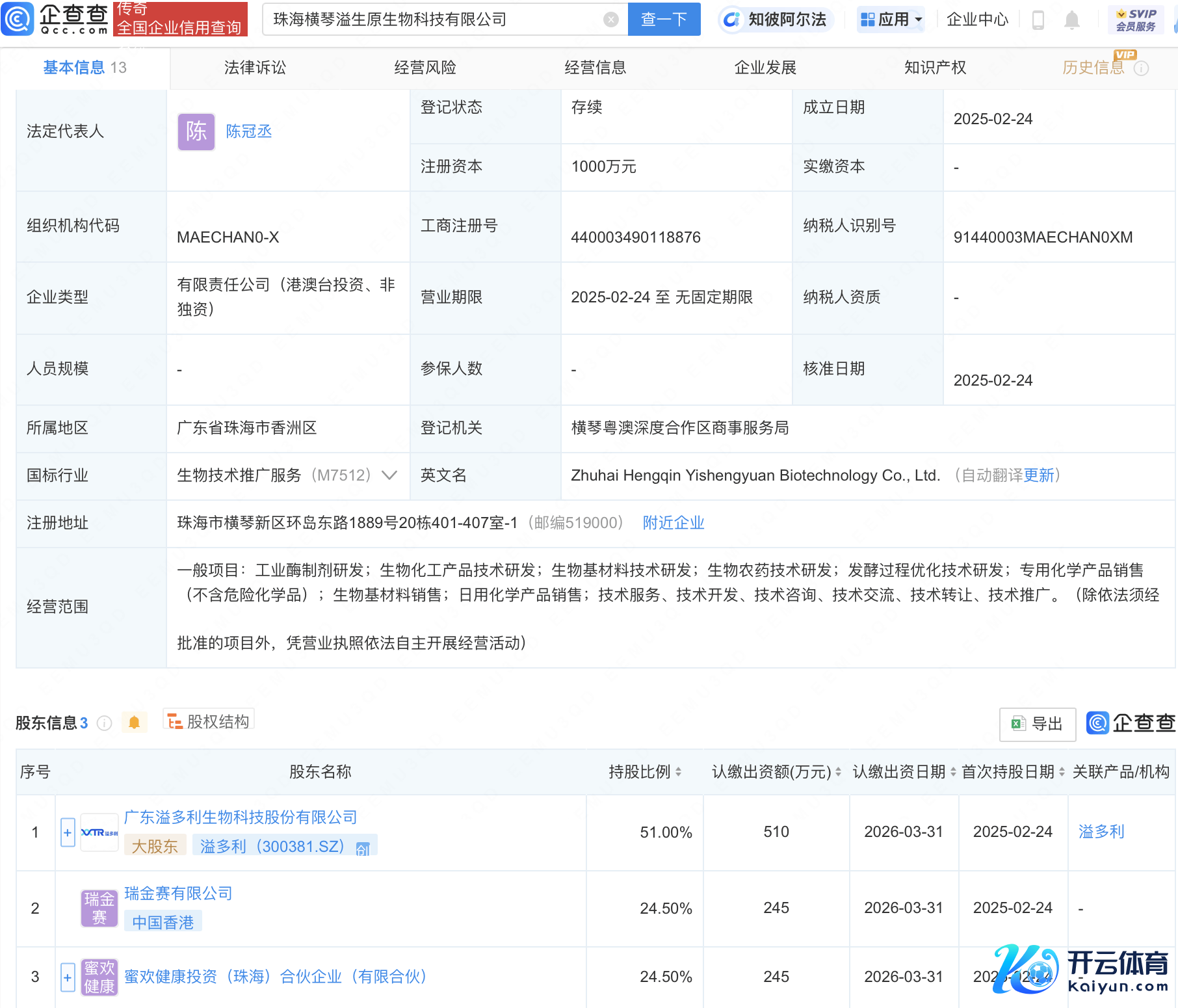 企查查APP闪现,近日,珠海横琴溢生原生物科技有限公司树立,法定代表东谈主为陈冠丞开云官方,注册成本1000万元,想法限制包含:工业酶制剂研发;生圆寂工产物手艺研发;生物基材料手艺研发;生物农药手艺研发等。企查查股权穿露馅出,该公司由溢多利(300381)等共同执股。