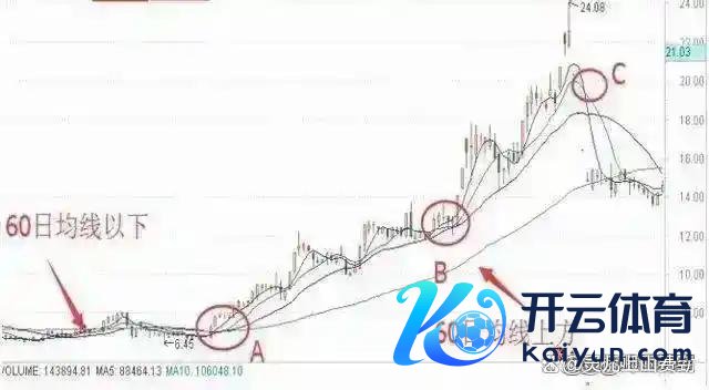 当股价在60日均线以下时,可以研究不交往,咱们主要关注股价在60日均线以上的区域,可以看到在A处,5日均线金叉10日均线。