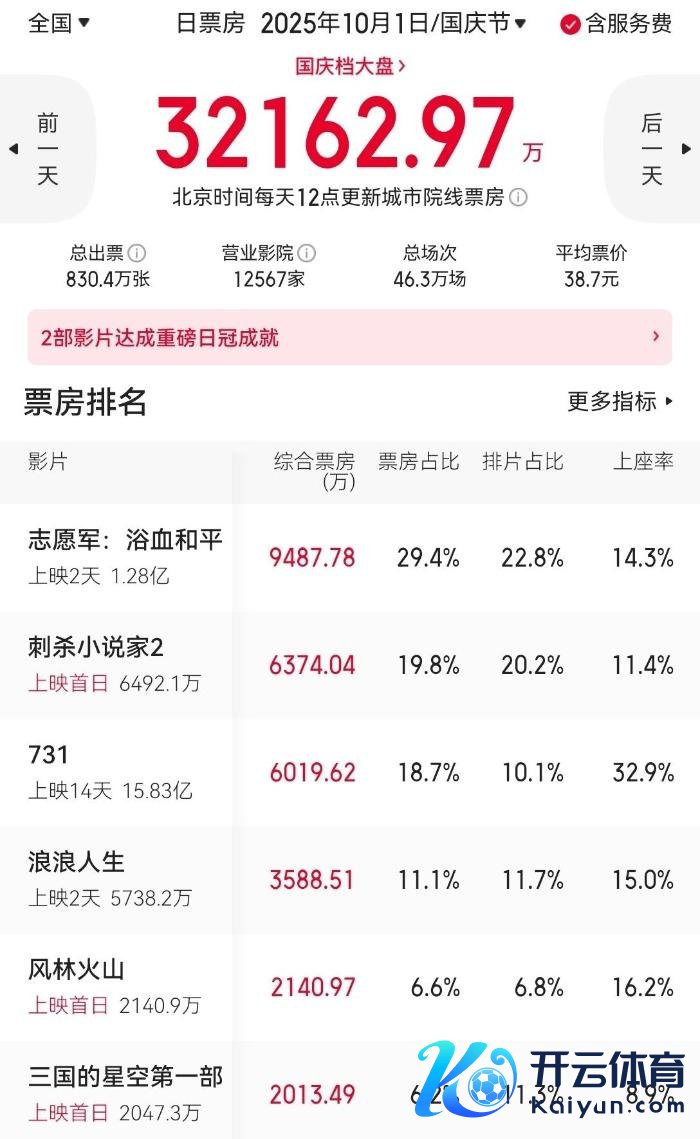 大皖新闻讯 把柄猫眼电影专科版数据,2025年国庆档首日票房打破3.2亿元kaiyun网址,为国庆假期电影市集苍劲开局。数据清晰,当日票房前五名影片鉴识为《志愿军:浴血和平》《刺杀演义家 2》《731》《浪浪东说念主生》和《三国的星空第一部》。票房前三名影片孝顺超70%票房,尤其值得一提的是,还是上映半个月的《731》在国庆档再度发力。