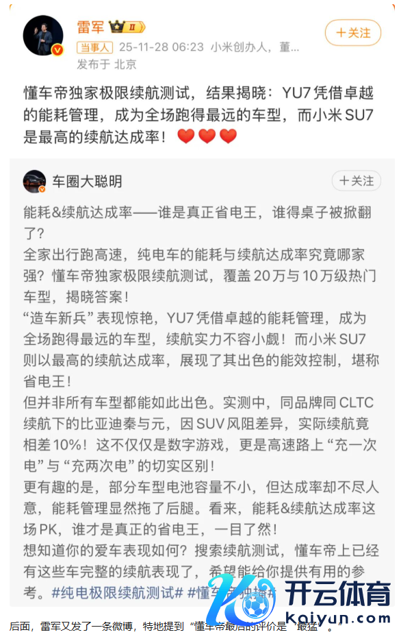 懂车帝一场高环极限续航测试,让小米汽车在争议中站上热搜——10℃低温、120km/h匀速、满载375公斤的严苛条目下,小米YU7以420公里实测续航拿下“最长”,SU7以54.86%续航达成率摘得20万级第一,雷军接连两条微博回答“最猛”评价kaiyun网址,却也没能平息“充值帝”的质疑。这场测试看似是一次居品实力的比拼,实则折射出新动力行业的深层变局:当续航、智驾的竞争参加深水区,车企们已偷偷将眼神投向了更远的“机器东说念主战场”。