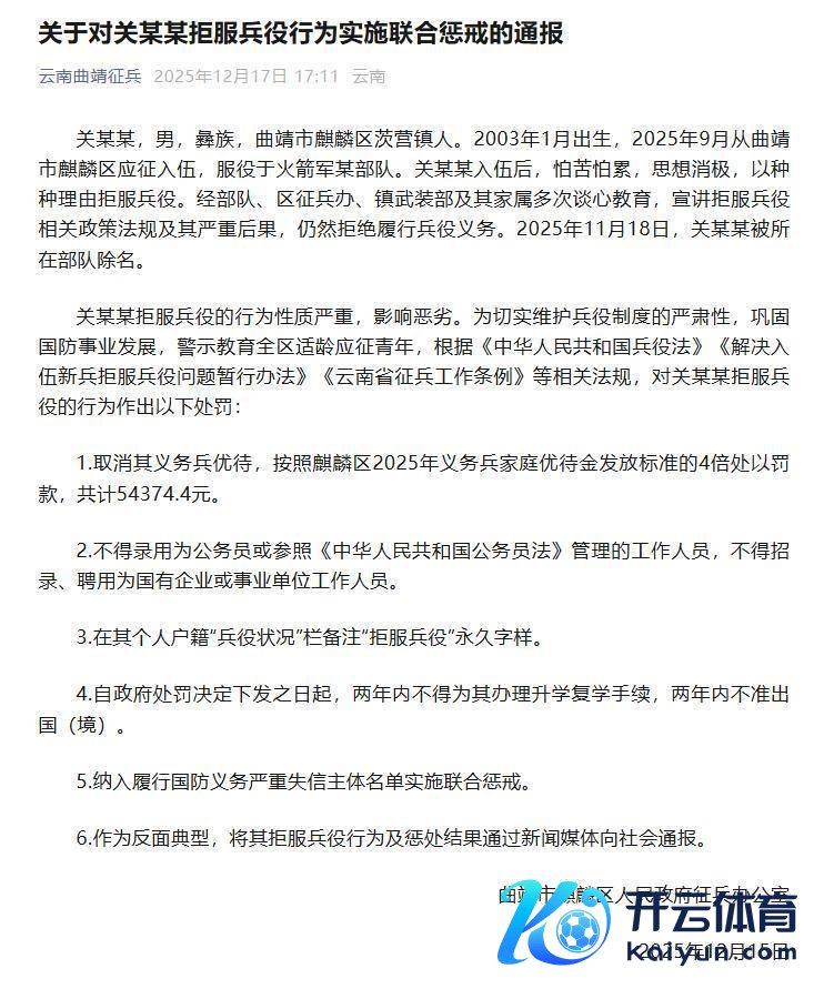 据“云南曲靖征兵”微信公众号12月17日音书,云南省曲靖市麒麟区东说念主民政府征兵办公室日前通报关某某拒服兵役行为及惩处赶走,包括罚金54374.4元,不得托福为公事员或参照《中华东说念主民共和国公事员法》照应的责任主说念主员。