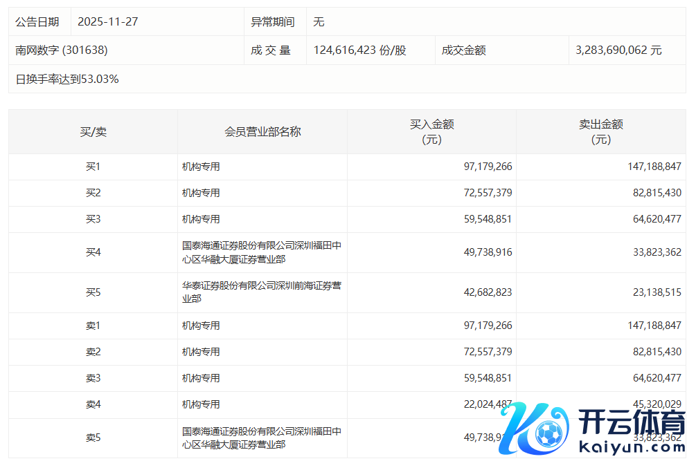南网数字:全天换手率达53.03%kaiyun官方网站登录入口,4机构悉数净卖出8863.48万元南网数字:全天换手率达53.03%,4机构悉数净卖出8863.48万元