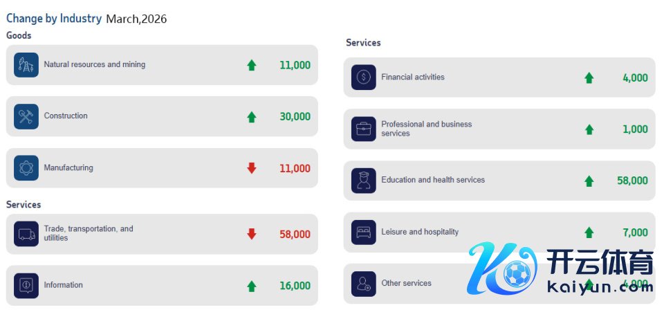 在以服务业为主导的好意思国经济中,三月出现了冷落的办事均衡——商品出产者加多了3万个办事岗亭(采矿1.1+诞生3-制造业1.1),服务业则创造了3.2万个岗亭。