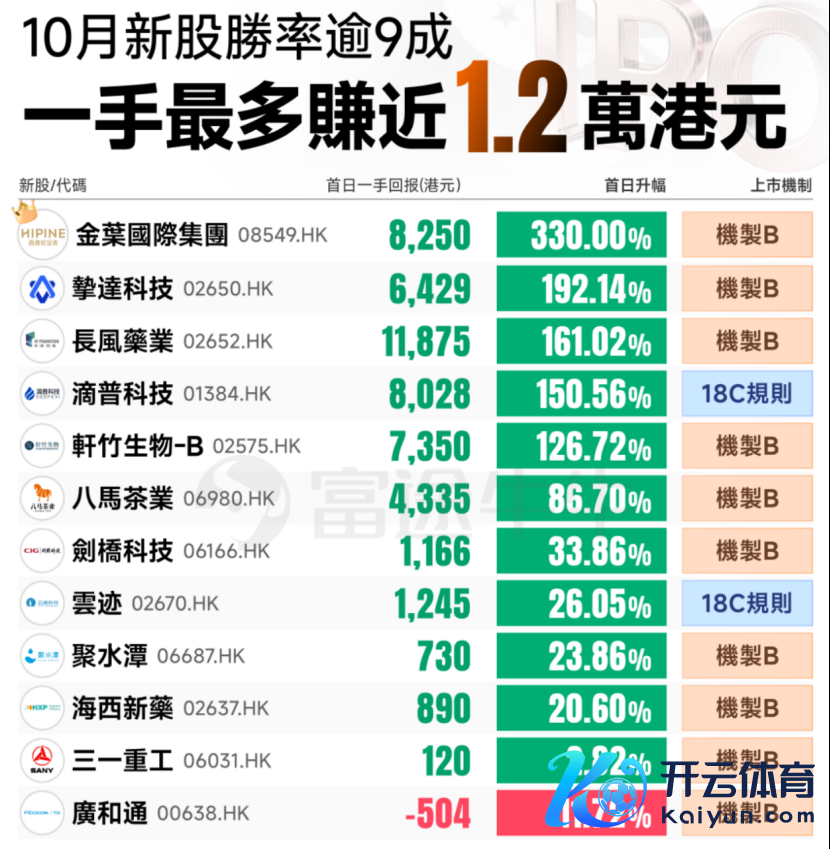 富途数据露出,10月港股新股市集执续红火,12只新股中有11只在上市首日录得高潮。其中,金叶国外集团首日涨幅最高达330%,长风药业中签答谢最为丰厚,一手答谢高达约12000港元。